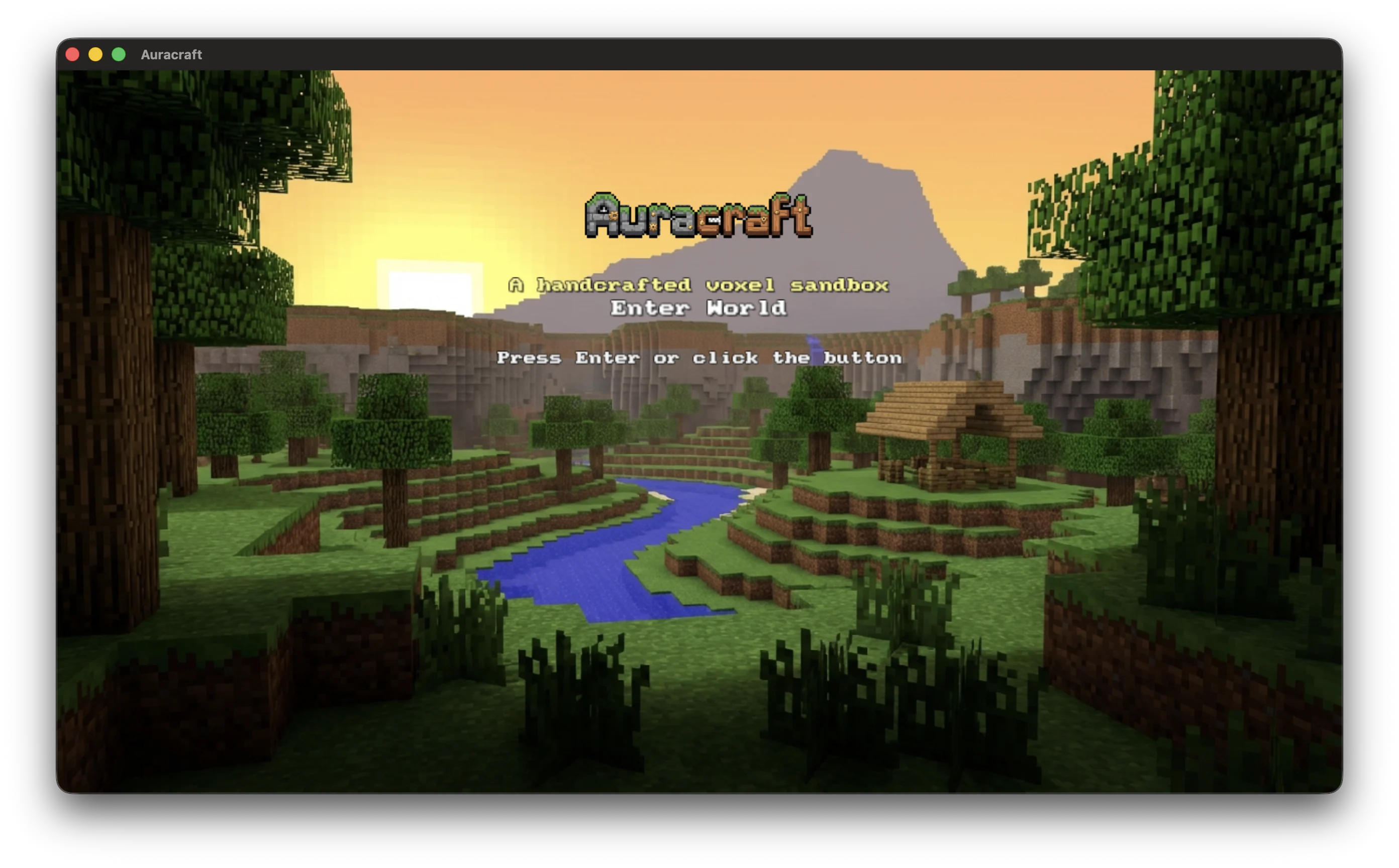 A handcrafted survival-style voxel scene with a native 3D renderer, chunked terrain, and a full-screen block-world mood.